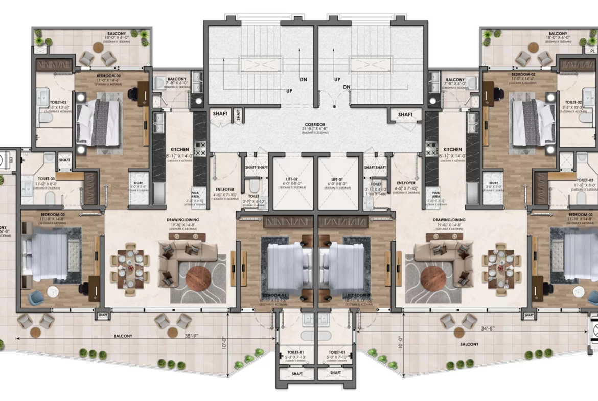 Each 3BHK flat is designed to deliver generous living space and comfort. The layout includes three well‑sized bedrooms, attached bathrooms, a large living‑dining area and sun‑lit balconies that face the landscaped green surroundings. Furthermore, thoughtfully positioned windows and a dual‑core, both‑sides‑open design bring in natural light and cross ventilation, enhancing comfort and freshness.